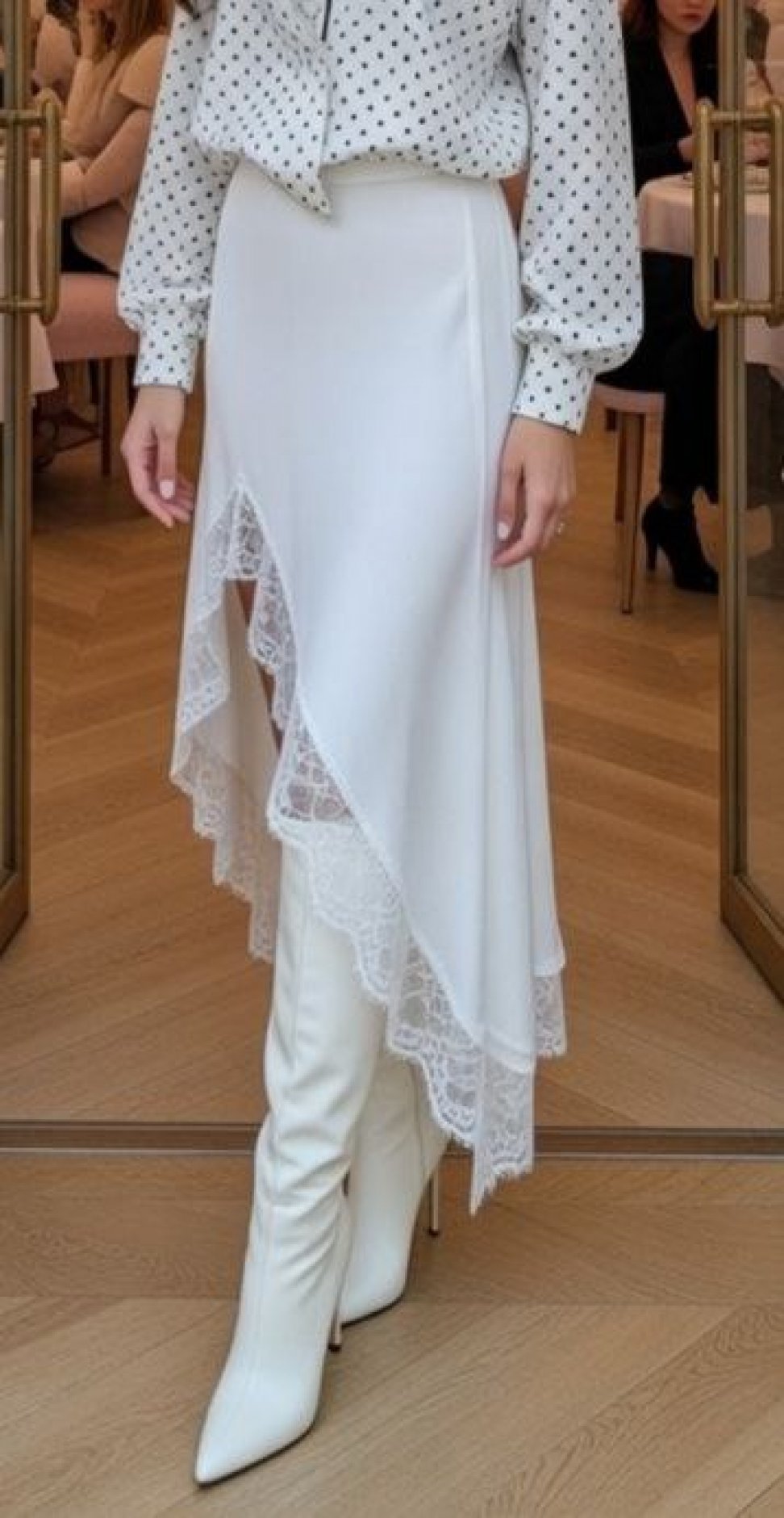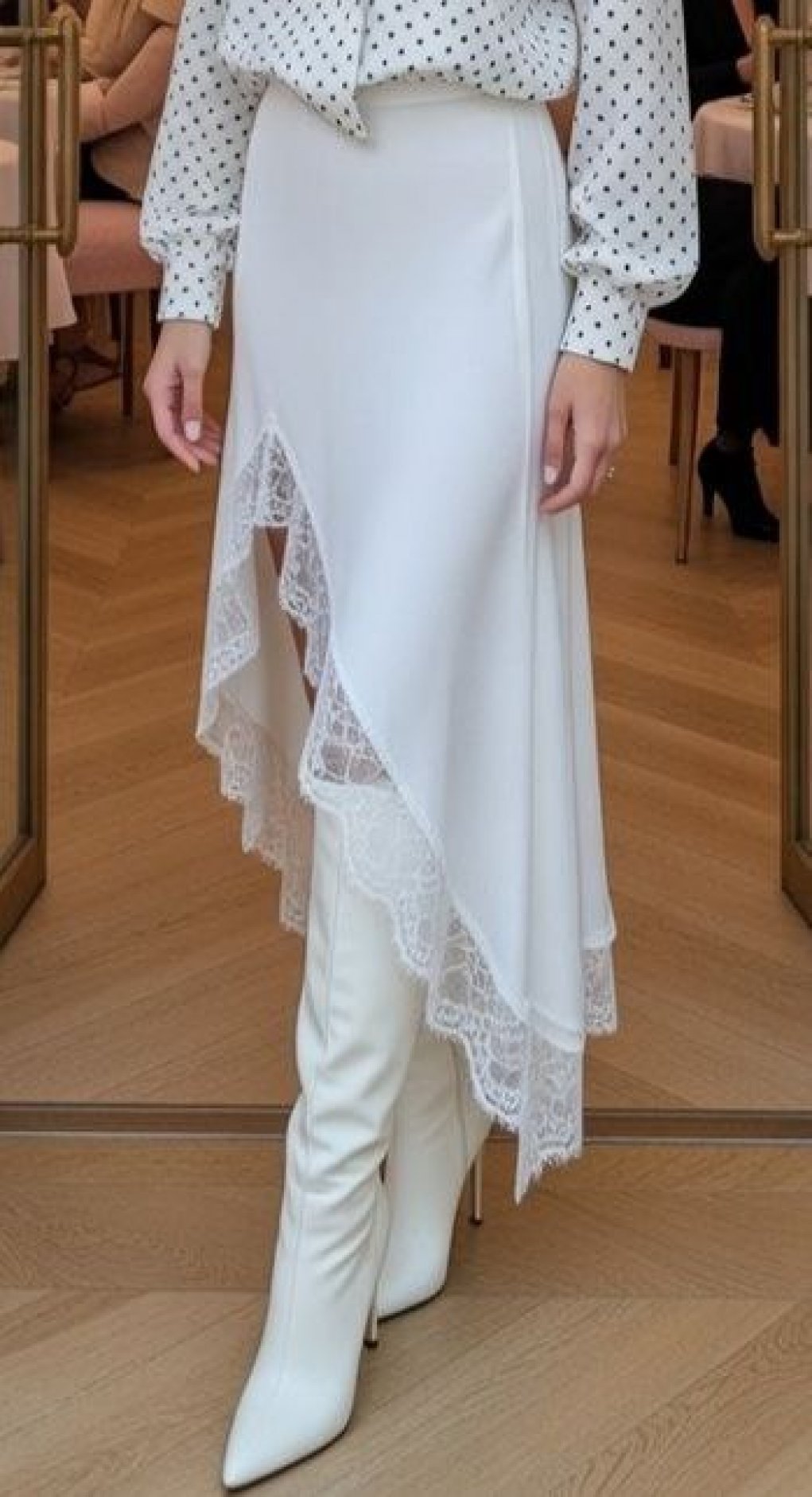 Total White Look: поєднуйте із білою блузою в горох (як на фото) та високими шкіряними чоботями для створення ультрамодного та свіжого образу.