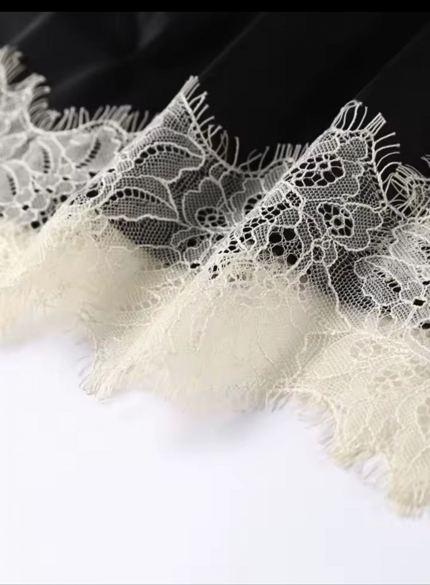 Шляхетні матеріали: Поєднання щільного чорного шовку та справжнього французького мережива створює розкішну гру фактур.