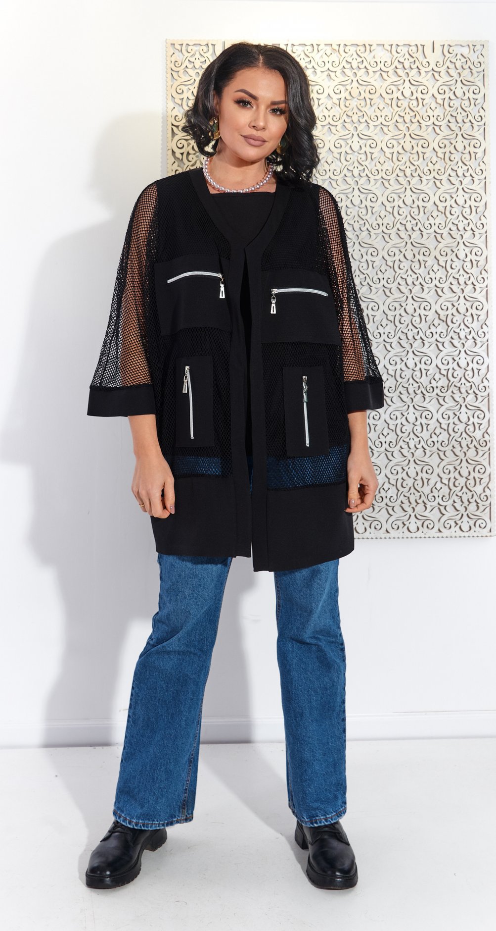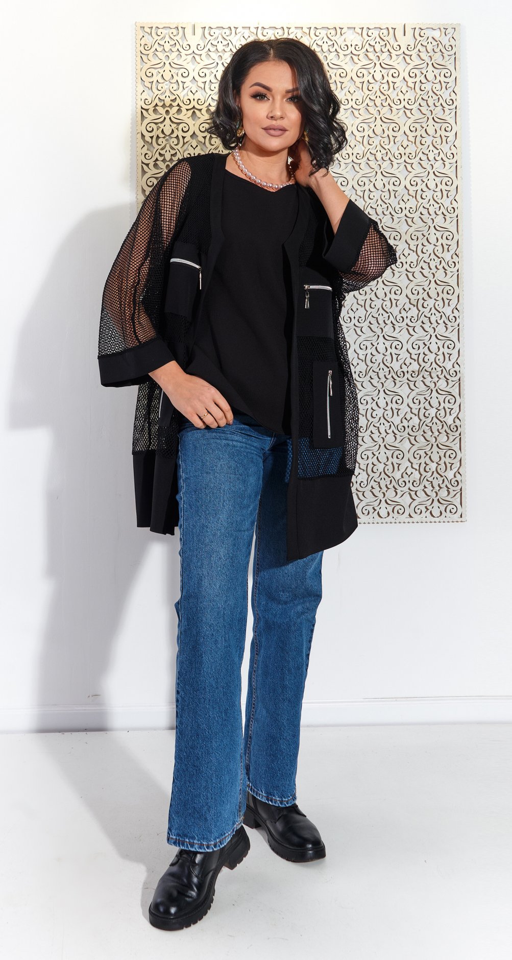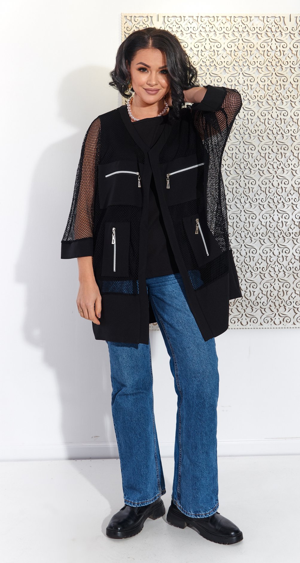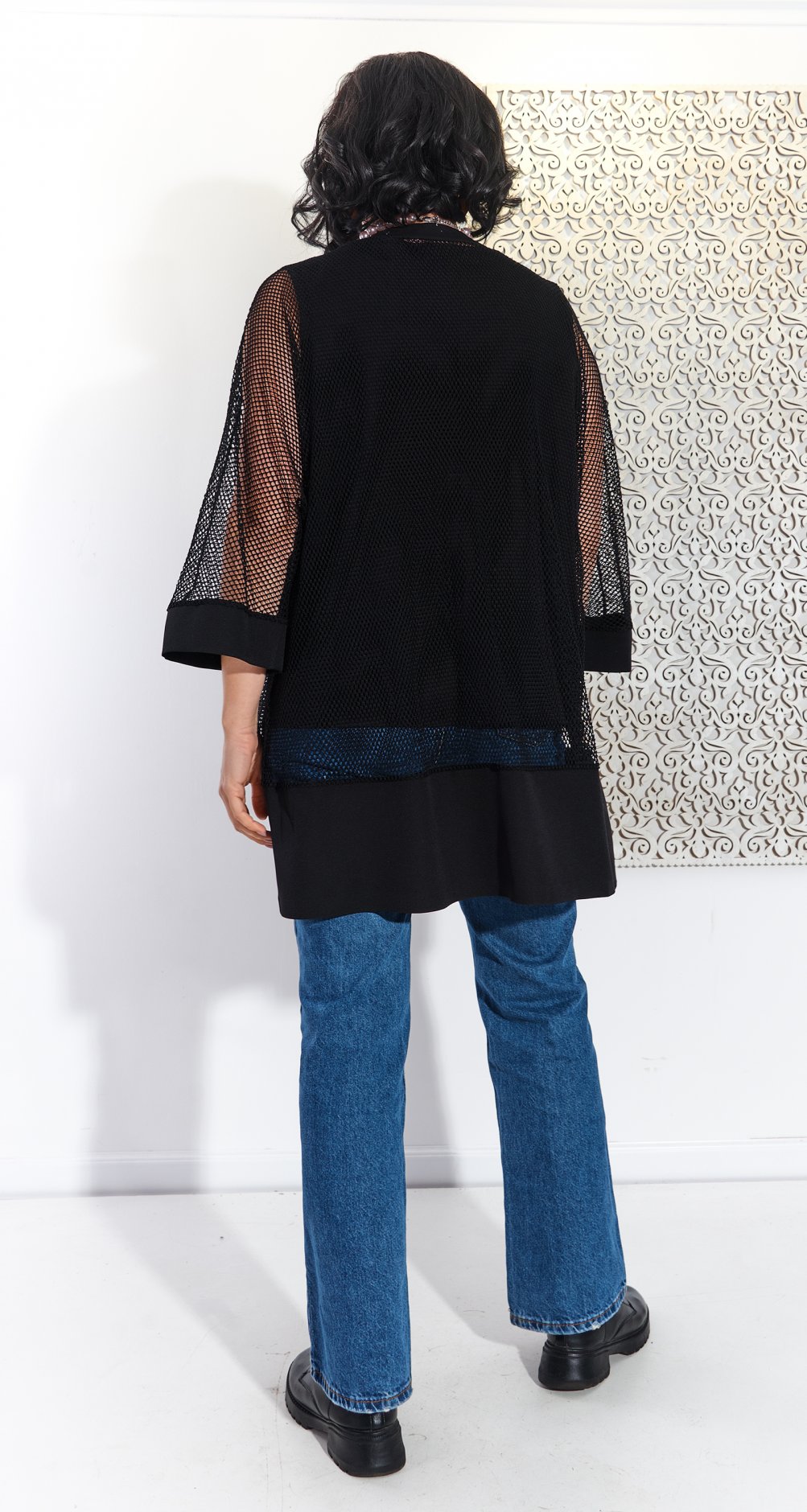Стильний комплект, який підкреслить вашу індивідуальність! Чорна туніка вільного крою з рукавами 3/4 ідеально поєднується з топом та створює легкий, але ефектний образ. Унікальна сітка та обробка в тон надають туніку легкості, а великі накладні кишені із сріблястими змійками додають сучасний акцент. Ідеально підходить для сміливих, впевнених у собі жінок, які цінують комфорт та стиль.