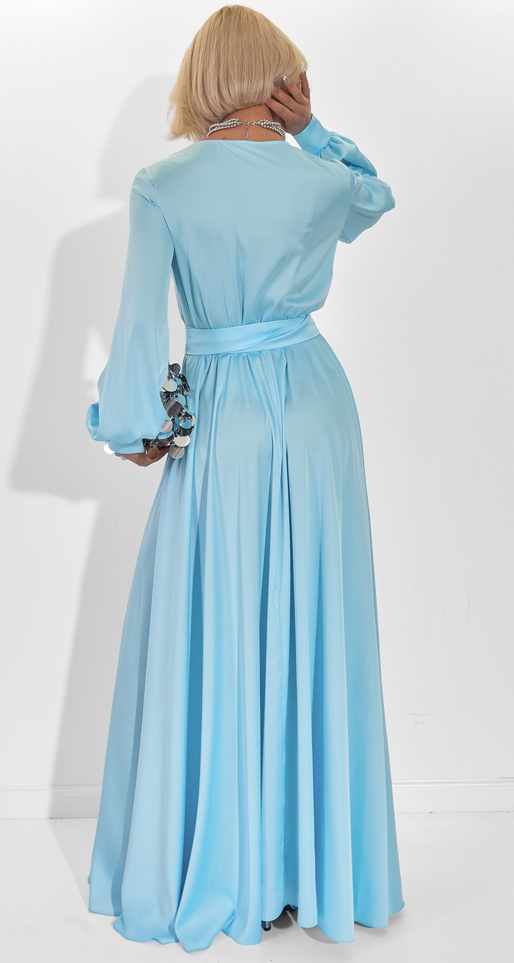 Ефектний матеріал: Сукня виготовлена з преміального еко-шовку, який має розкішний сатиновий блиск і гарно струмує по фігурі.