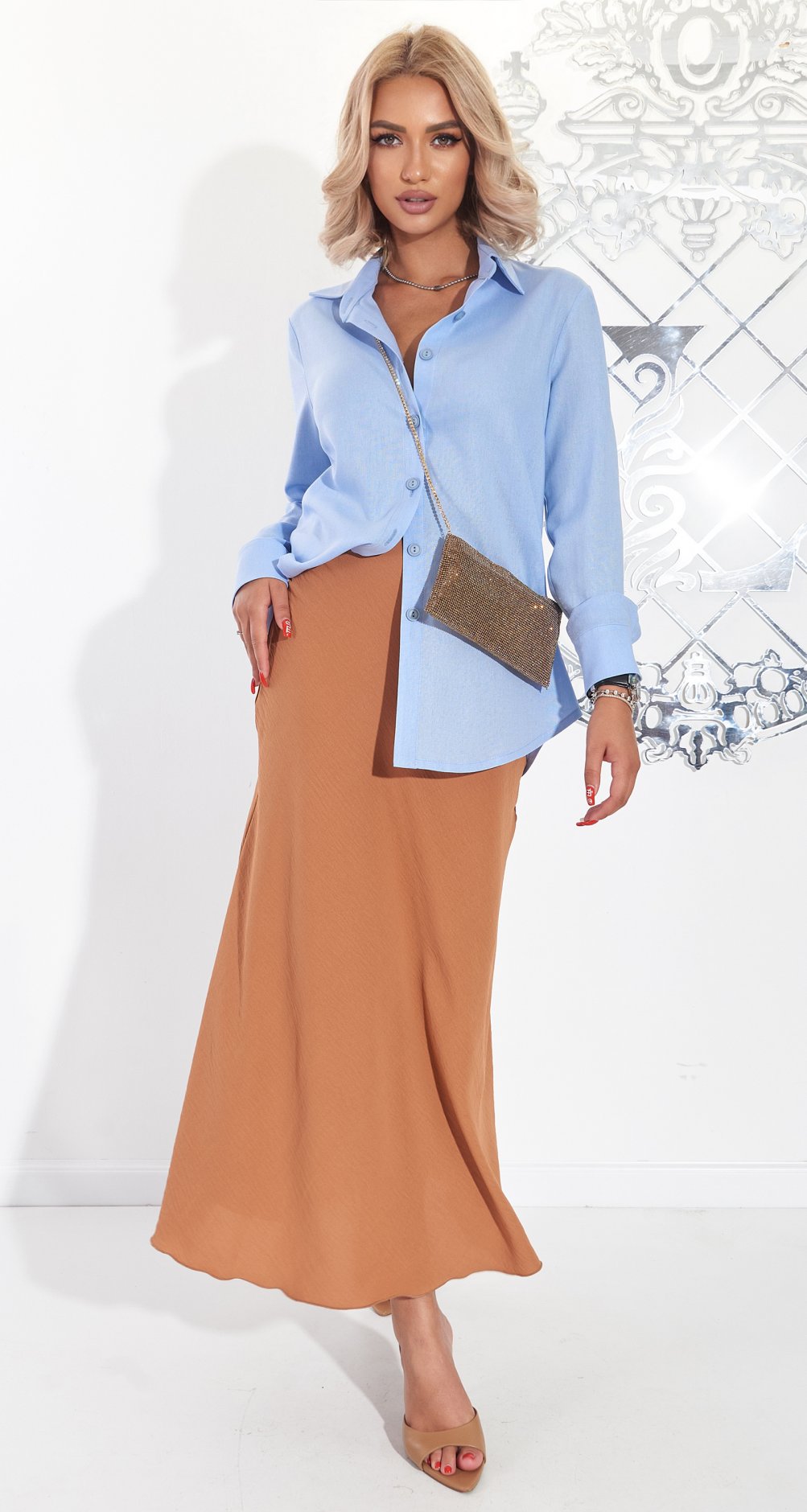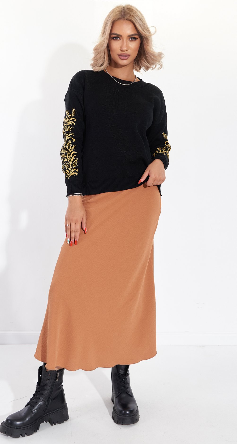 Вона підходить до всього! Усі модні моделі светрів, сорочок, жилеток, лонгслівів та бомберів комбінуються з косою спідницею у довжині міді!
