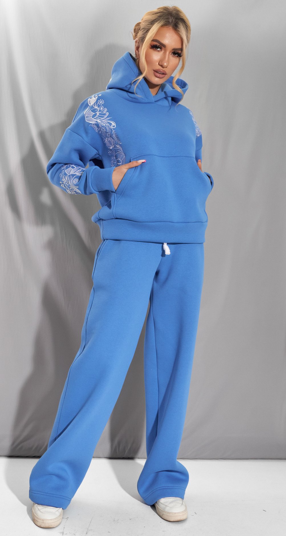 Вільний крій худорлявий з об'ємним капюшоном і широкі штани палаццо забезпечують повну свободу рухів, роблячи цей костюм незамінним для прогулянок, зустрічей з друзями або затишних вечорів будинку.