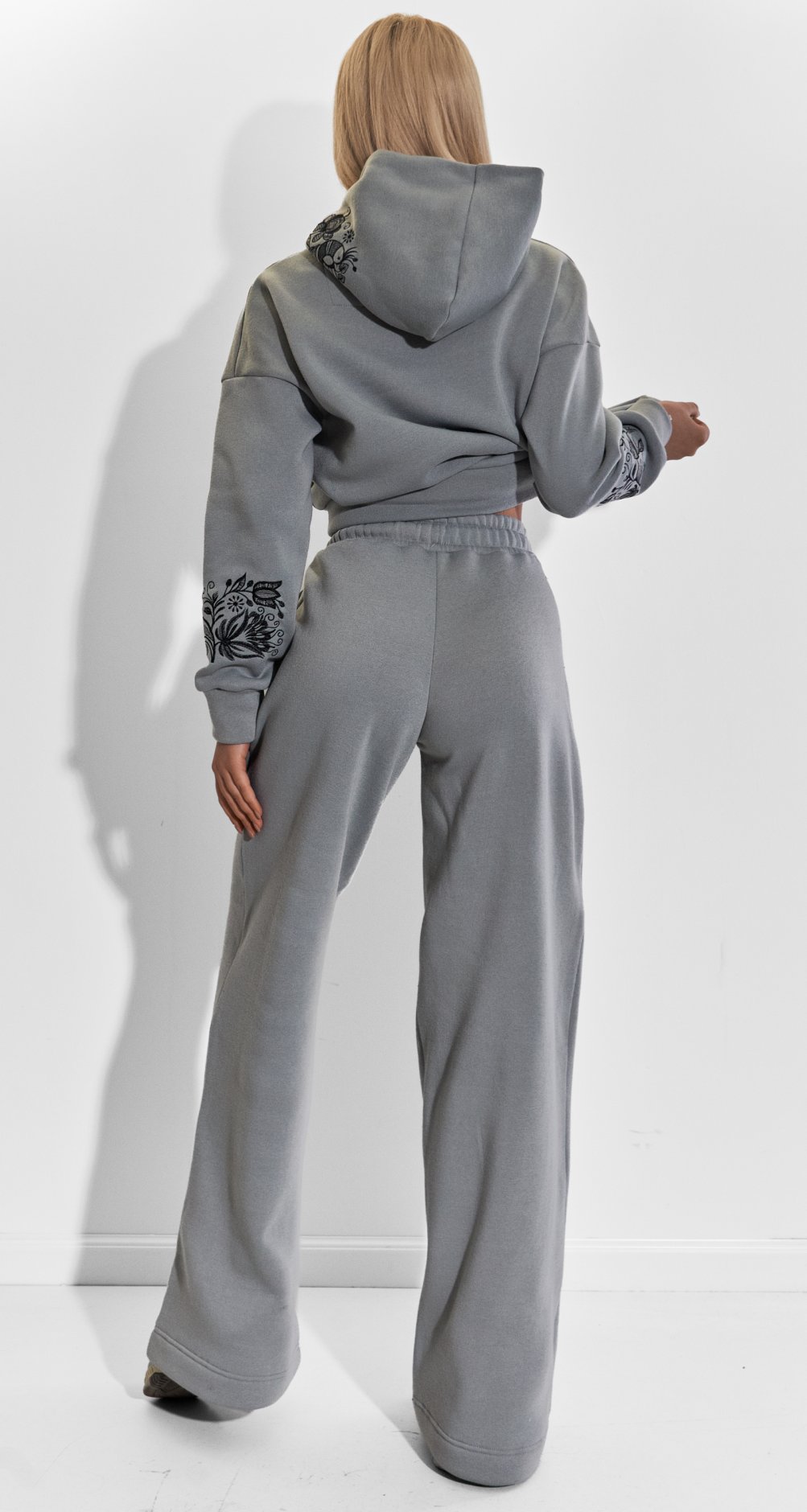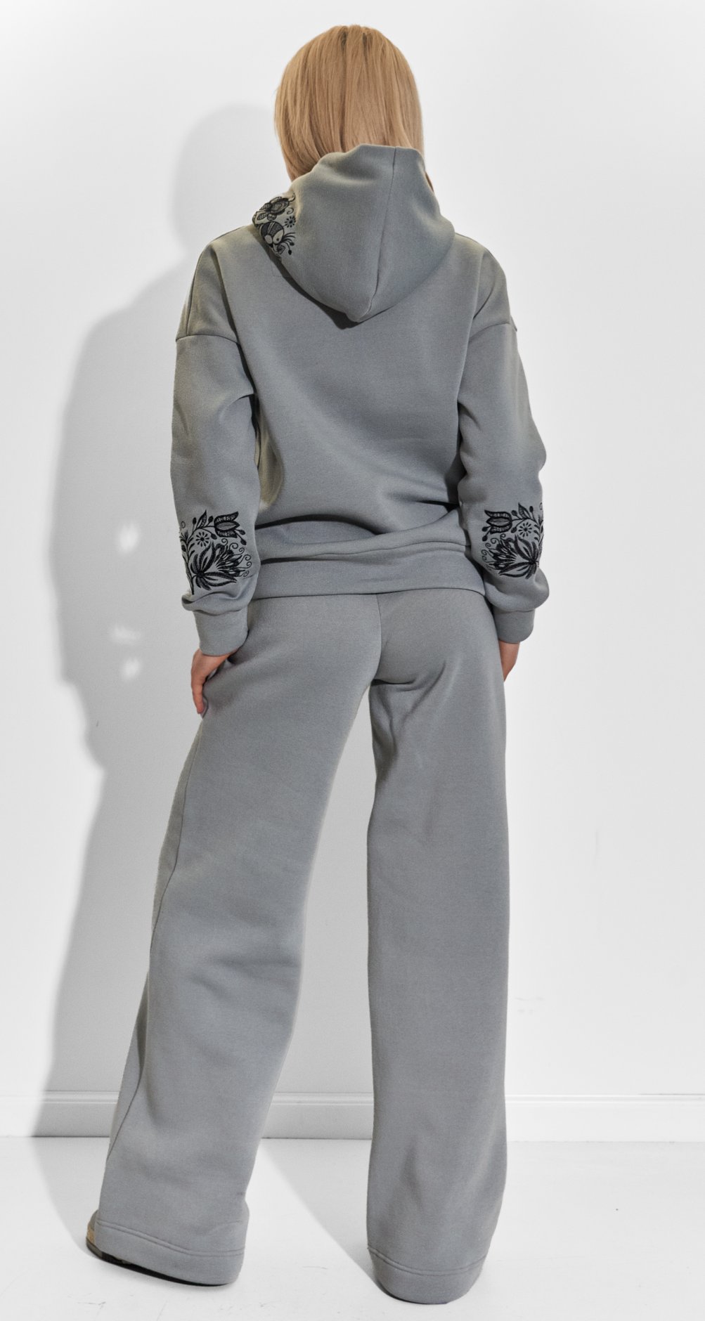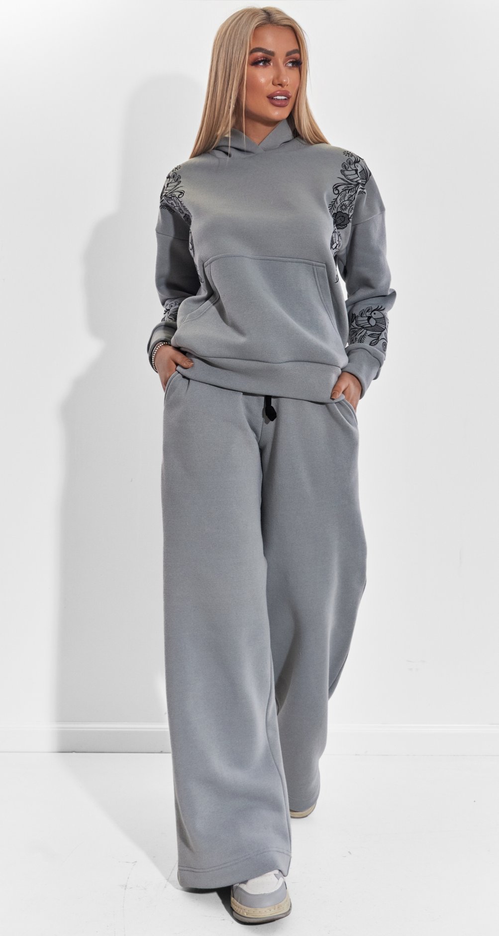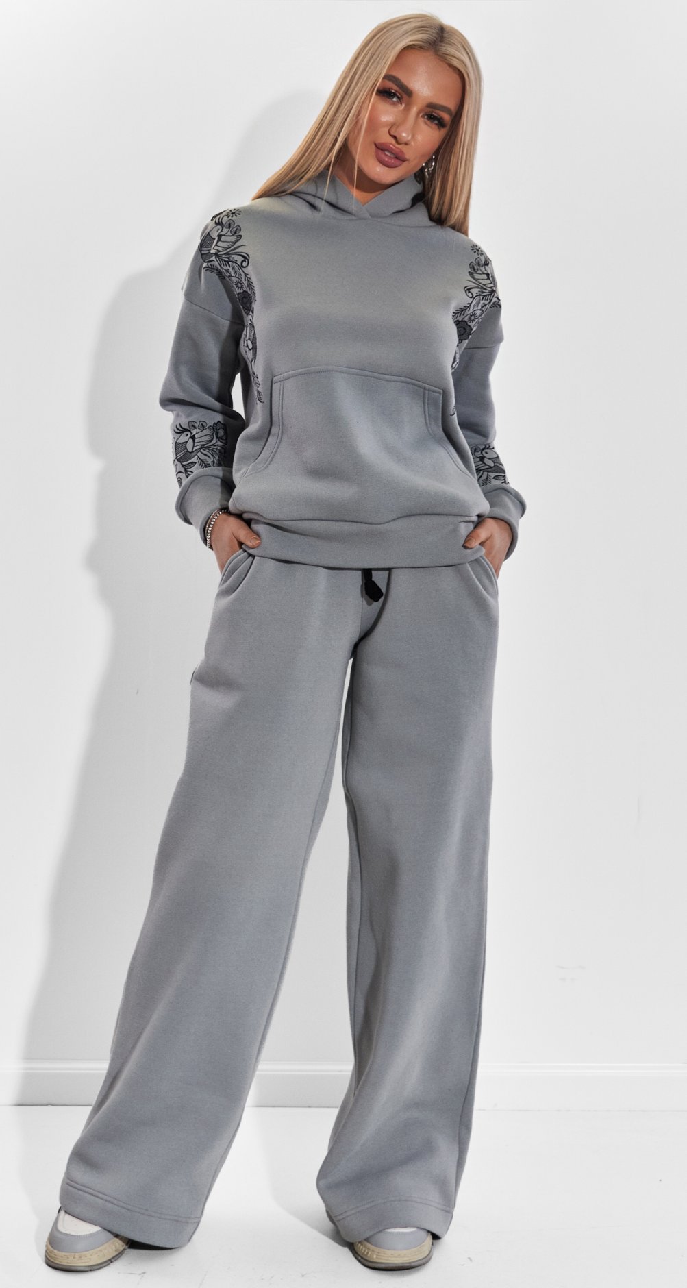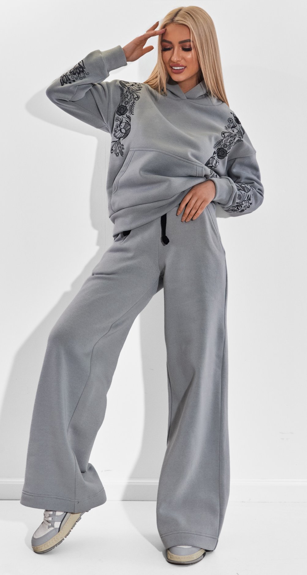 Вільний крій худорлявий з об'ємним капюшоном і широкі штани палаццо забезпечують повну свободу рухів, роблячи цей костюм незамінним для прогулянок, зустрічей з друзями або затишних вечорів будинку.