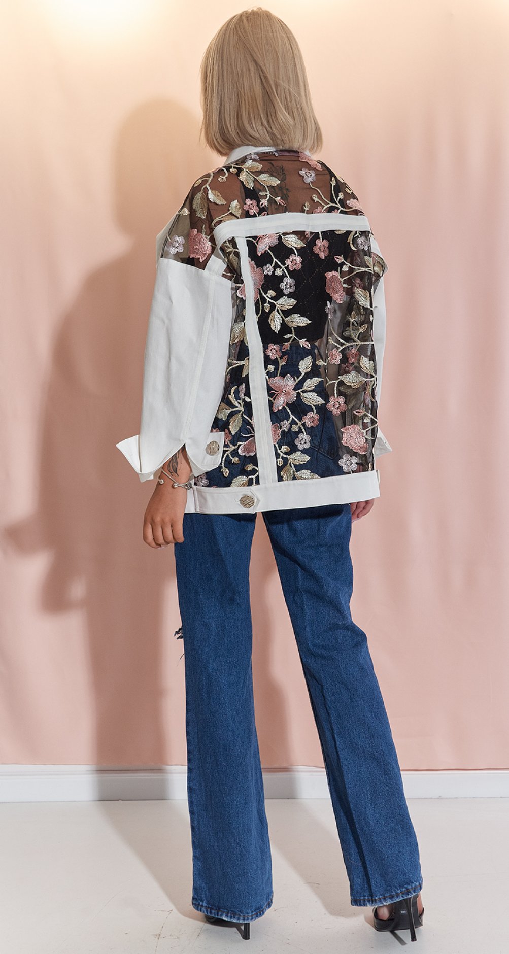 * Вишукана сітка з вишивкою: спинка прикрашена чудовою сіткою з квітковою вишивкою, що надає куртці неповторний шарм і жіночність.